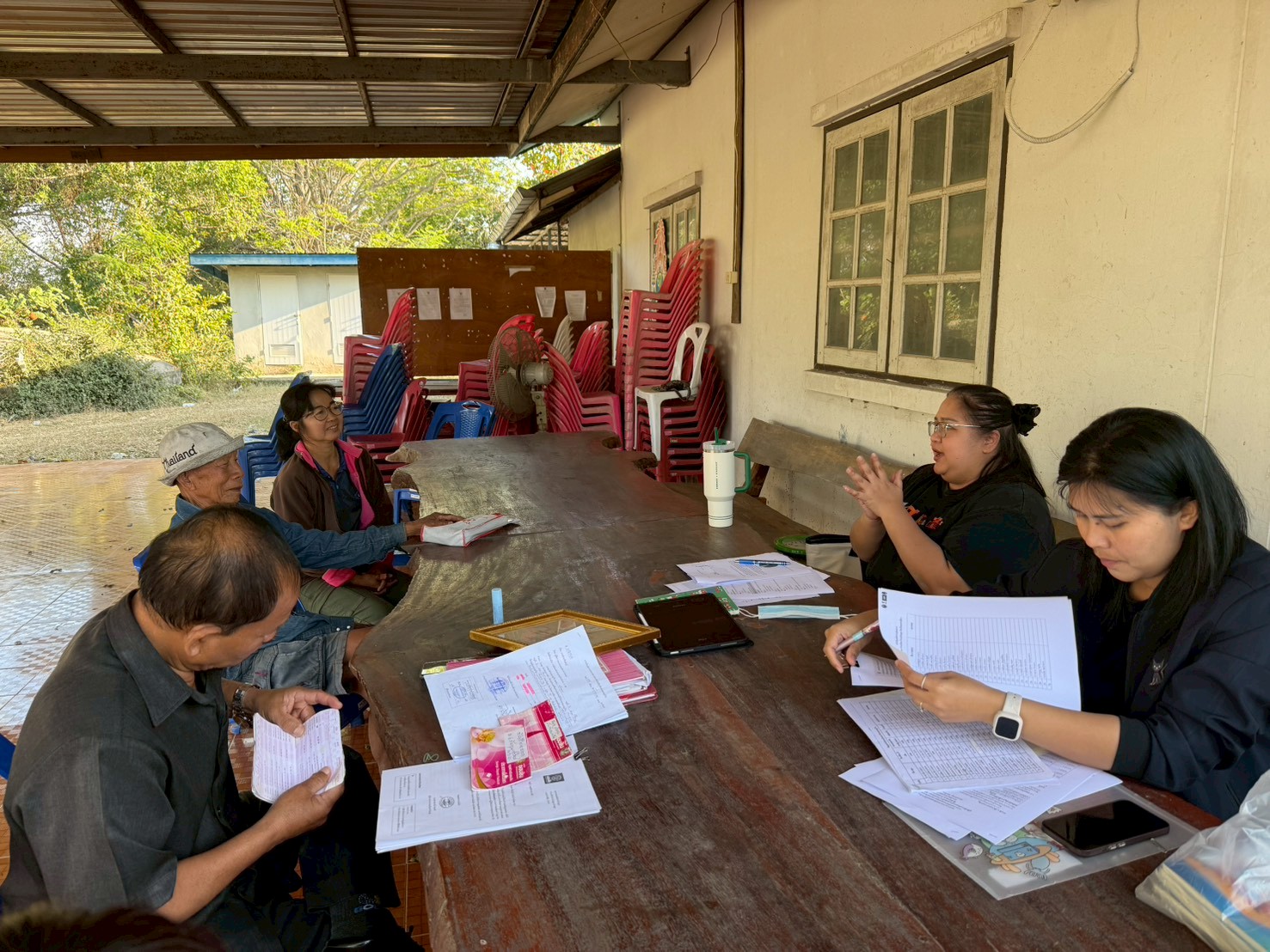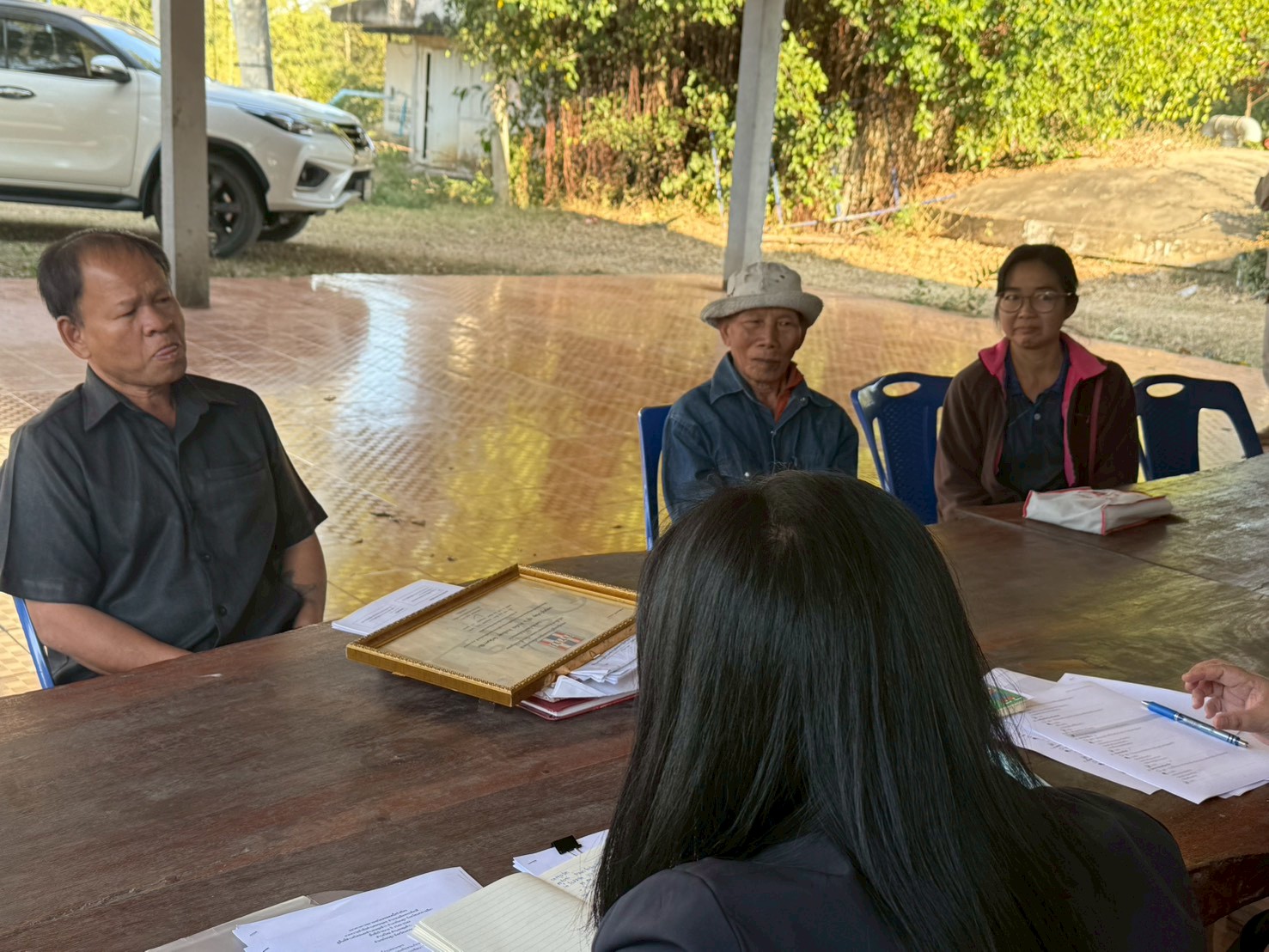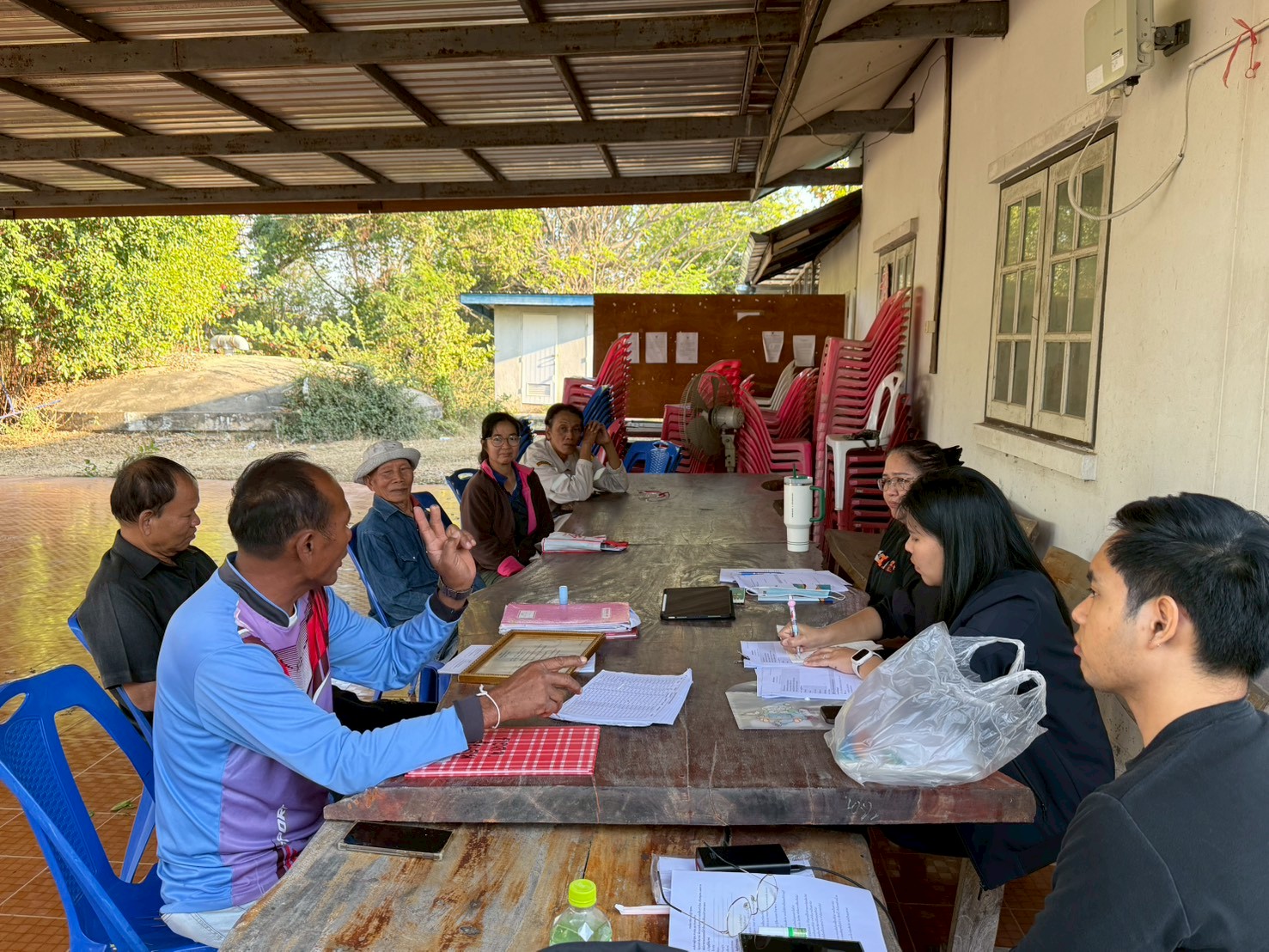 ในการลงพื้นที่ครั้งนี้ ได้มีการประชุมร่วมกับผู้ให้สัมภาษณ์กองทุน ได้แก่ นายมงคล เจริญสุข ผู้ใหญ่บ้าน ,นายไพโรจน์ เพ็งกลาง ประธานกองทุนหมู่บ้าน และครูจันทร์ จูงกลาง ประธานกองทุนปลา เพื่อแลกเปลี่ยนข้อมูลเกี่ยวกับการดำเนินงานกองทุนหมู่บ้าน ระบบการให้กู้ยืมเงิน ระเบียบและเงื่อนไขการปล่อยกู้ การออมเงินของคนในชุมชน ตลอดจนสถานการณ์ทางเศรษฐกิจและภาระหนี้สินของครัวเรือน พร้อมร่วมกันวิเคราะห์และหาแนวทางการลดหนี้อย่างยั่งยืน