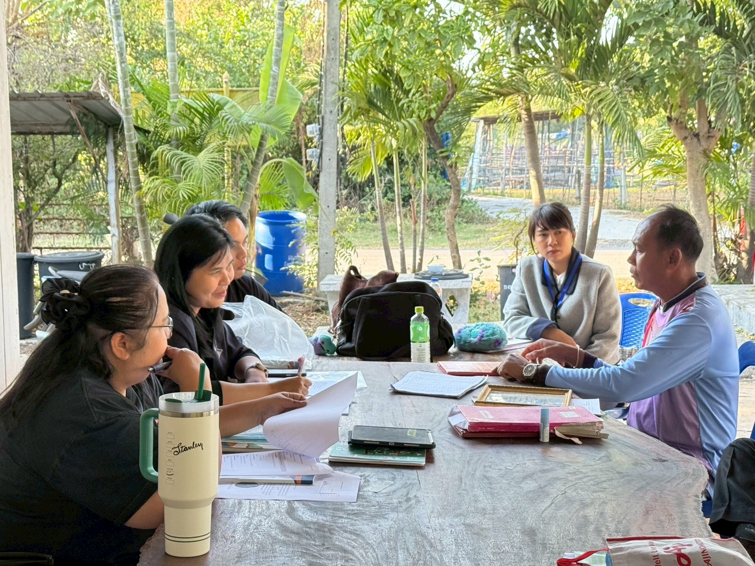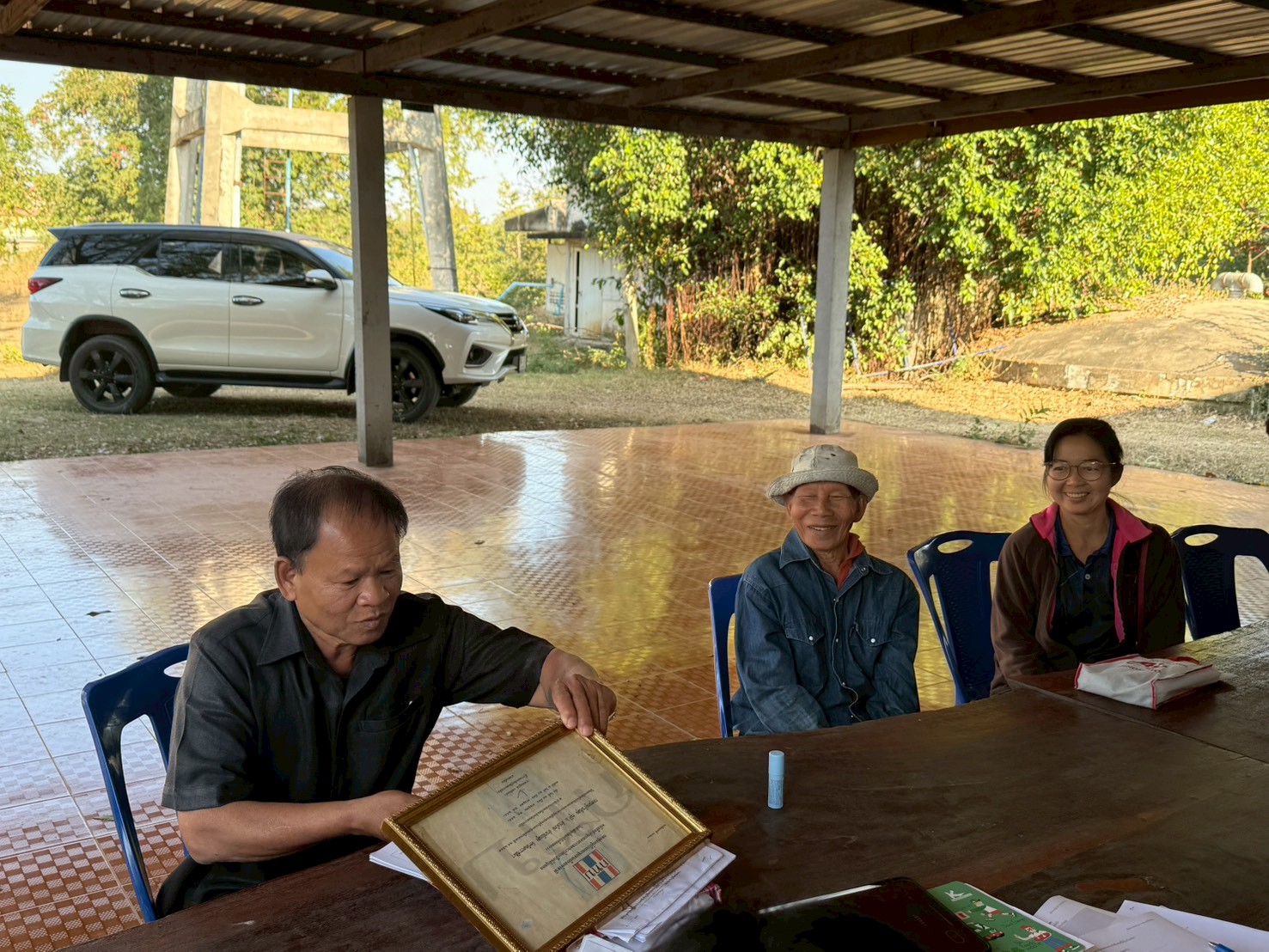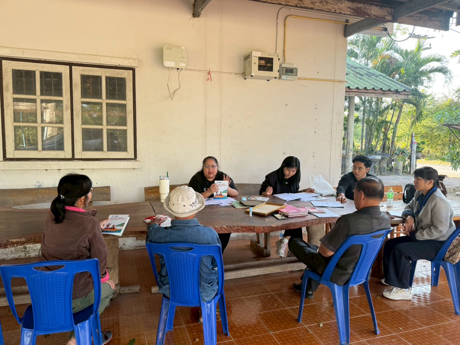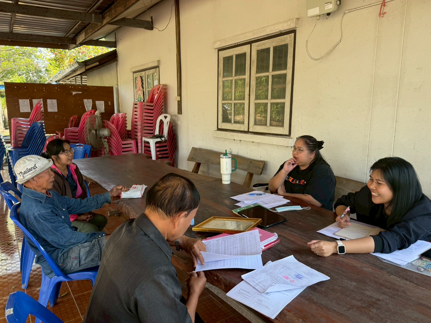 ในการลงพื้นที่ครั้งนี้ ได้มีการประชุมร่วมกับผู้ให้สัมภาษณ์กองทุน ได้แก่ นายมงคล เจริญสุข ผู้ใหญ่บ้าน ,นายไพโรจน์ เพ็งกลาง ประธานกองทุนหมู่บ้าน และครูจันทร์ จูงกลาง ประธานกองทุนปลา เพื่อแลกเปลี่ยนข้อมูลเกี่ยวกับการดำเนินงานกองทุนหมู่บ้าน ระบบการให้กู้ยืมเงิน ระเบียบและเงื่อนไขการปล่อยกู้ การออมเงินของคนในชุมชน ตลอดจนสถานการณ์ทางเศรษฐกิจและภาระหนี้สินของครัวเรือน พร้อมร่วมกันวิเคราะห์และหาแนวทางการลดหนี้อย่างยั่งยืน
