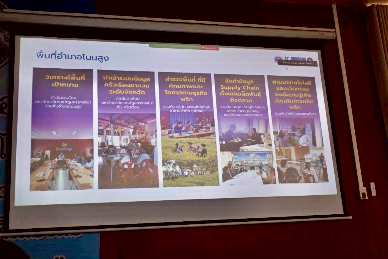 วันที่ 15 มกราคม พ.ศ. 2569 มหาวิทยาลัยราชภัฏนครราชสีมา ประชุมนำเสนอผลการดำเนินงานโครงการ “โมเดลแก้จนระดับอุตสาหกรรมเชิงพื้นที่ (Area Based Industry) หรือ พริกจินดา” ภายใต้โครงการพัฒนาและยกระดับแพลตฟอร์มเพื่อการแก้ไขปัญหาความยากจน จังหวัดนครราชสีมา (ระยะที่ 2) เพื่อสร้างรายได้และโอกาสที่ยั่งยืนให้แก่เกษตรกรในพื้นที่ ณ ที่ว่าการอำเภอโนนสูง จังหวัดนครราชสีมา