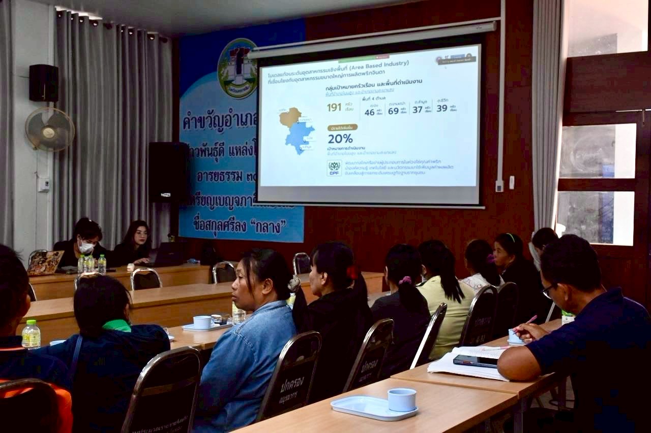 ภายในงานมีการแลกเปลี่ยน "แนวทางการเชื่อมโยงการผลิตพริกจินดากับอุตสาหกรรม" โดยได้รับเกียรติจาก คุณทวีป จีนะ จากสำนักงานจัดซื้อกลาง CPF มาร่วมให้ข้อมูลเชิงลึกด้านมาตรฐานสินค้าและกระบวนการรับซื้อ เพื่อเตรียมความพร้อมให้กับตัวแทนเกษตรกรในพื้นที่เป้าหมาย 2 อำเภอ 4 ตำบลหลัก ได้แก่